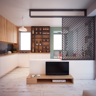 O um espaço de 34 metros quadrados projetado para um jovem casal. Quando duas pessoas vivem em uma pequena casa, é muito mais importante manter as coisas em aberto e organizado. As paredes são em grande parte sem adornos e sua cor branca certamente contribui para a sensação de mais espaço. Uma pequena área de cozinha com café bar é apenas um espaço suficiente para uns cocktails ou um jantar íntimo, o quarto separado significa que este casal não perde sua privacidade e numa eventual necessidade podem acomodar amigos em sua sala de maneira tranquila e organizada.